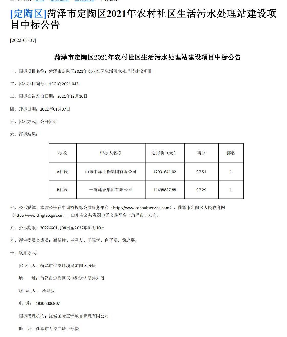 2022年1月7日,菏澤市公共資源交易中心公示了菏澤市定陶區(qū)2021年農(nóng)村社區(qū)生活污水處理站建設(shè)項目A標段中標結(jié)果,山東中澤工程集團有限公司成功中標,中標金額12031641.02元。