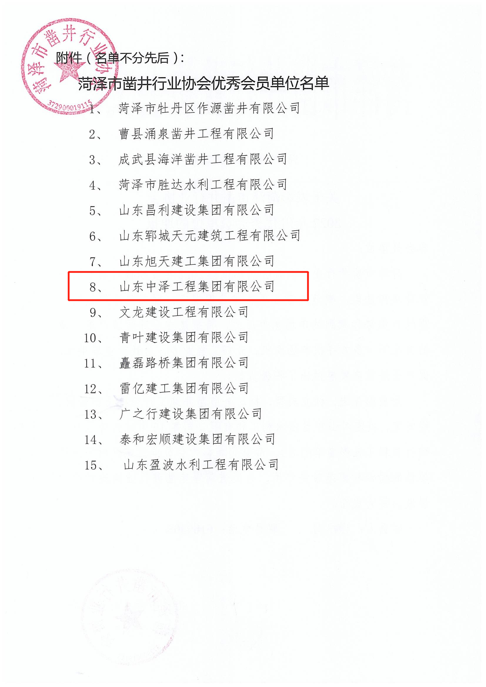 近日,根據(jù)菏澤市鑿井行業(yè)協(xié)會公布《關(guān)于表彰菏澤市鑿井行業(yè)協(xié)會2022年度優(yōu)秀會員單位的通報》的通知,山東中澤工程集團有限公司獲此殊榮。
