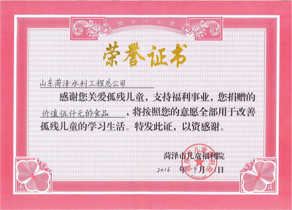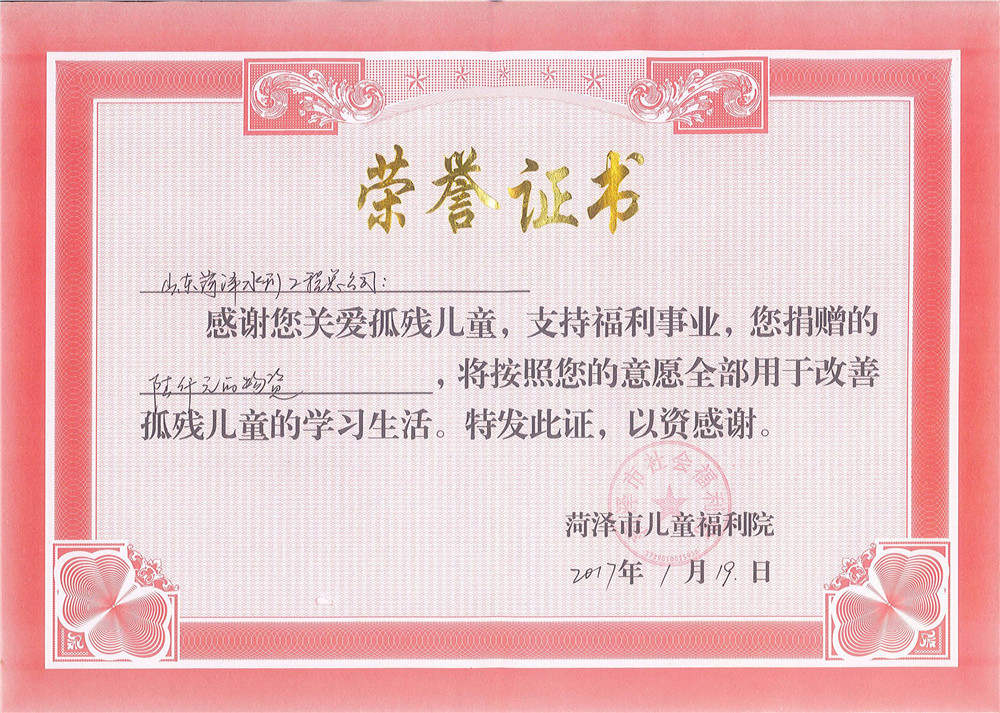 積極助力見義勇為募捐活動,僅僅山東菏澤水務(wù)工程有限公司踴躍奉獻愛心、積極回饋社會的一個縮影。自2015年以來,山東菏澤水務(wù)工程有限公司多次到菏澤福利院慰問并捐贈物資。自公司成立以來,堅持將中華優(yōu)秀傳統(tǒng)文化融入企業(yè)文化建設(shè)之中,將誠信忠厚、勤勞敬業(yè)、開拓進取、服務(wù)社會、實業(yè)報國等優(yōu)良傳統(tǒng)精髓,灌輸?shù)矫课粏T工的思想當中,使之成為人生奮斗、企業(yè)發(fā)展的源動力,更體國有企業(yè)應(yīng)有的服務(wù)意識和責任擔當。